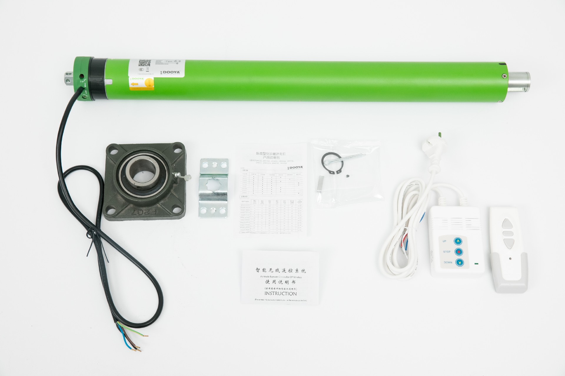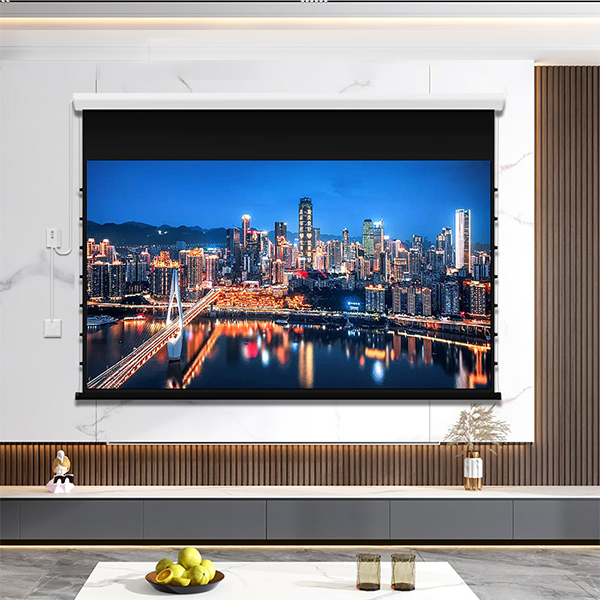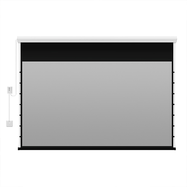The electric pull-wire screen features pull wires on both sides of the screen, which are connected to pulling mechanisms on both sides of the lower end of the screen. The lower end of the screen is equipped with a pull-down box, and two pulling mechanisms are located inside the pull-down box, positioned at both ends of its length. Each pulling mechanism includes a guide moving column and an eccentric wheel.