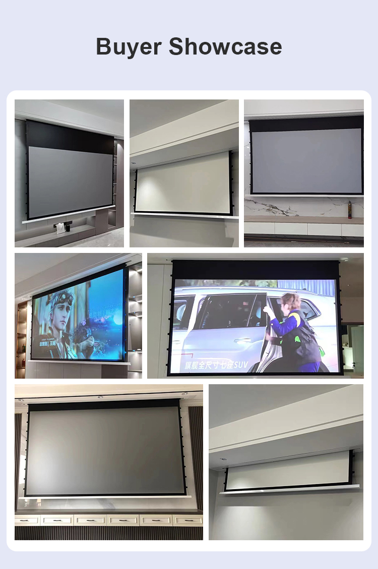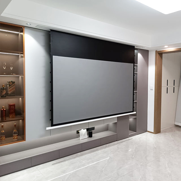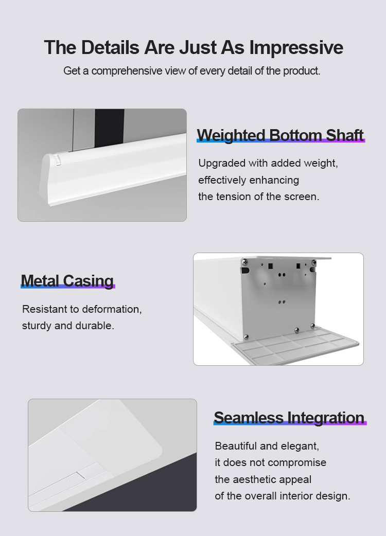 Seamlessly integrated into ceiling tiles, it complements various interior design styles. With remote wireless control, the screen height can be freely adjusted.