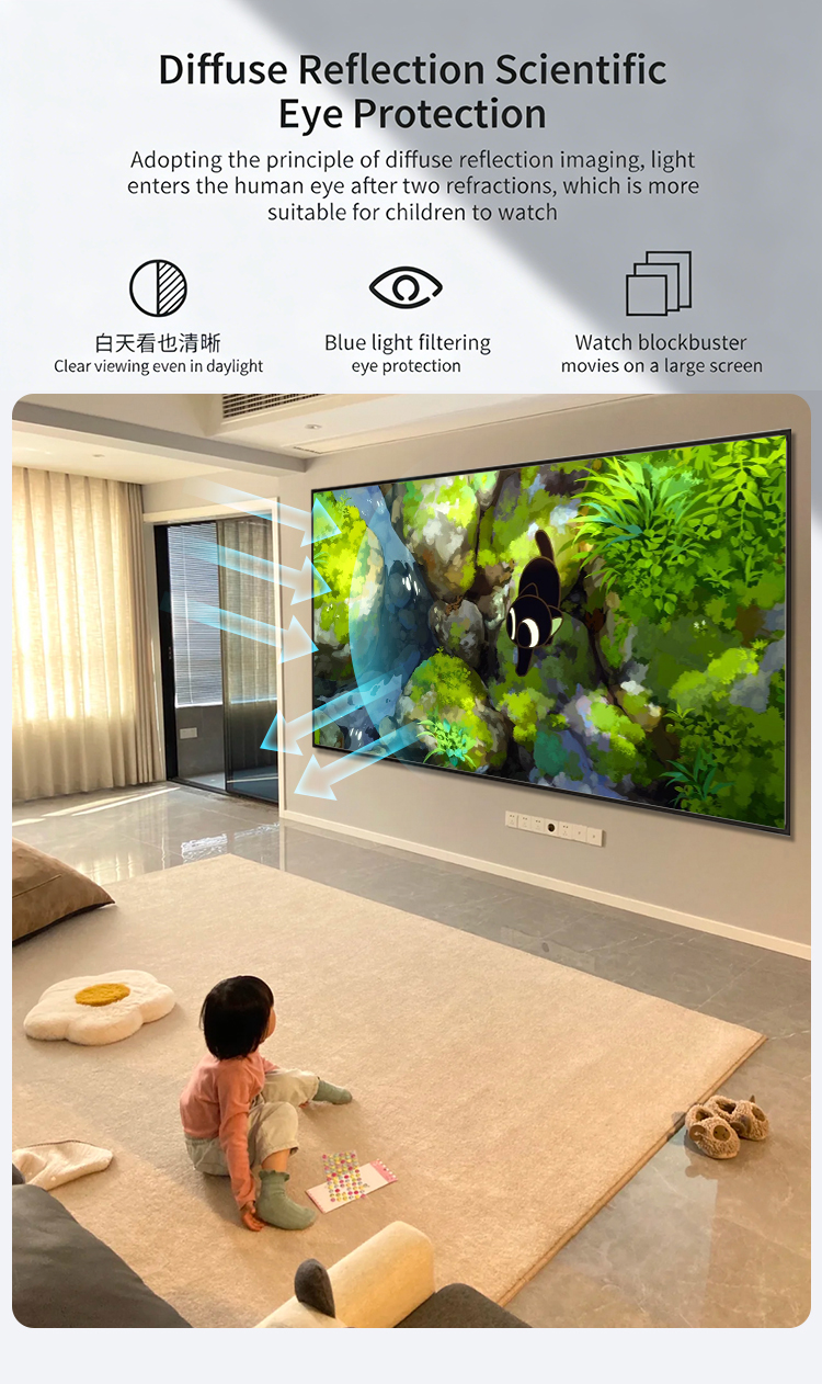 High-definition picture quality, authentic and delicate, faithfully reproducing every frame. The image is clear and delicate, ensuring no detail is missed, providing cinema-level enjoyment at every moment. The newly upgraded model requires no assembly and is shipped as a single piece. It utilizes the principle of diffuse reflection imaging, with light undergoing secondary refraction before entering the human eye.